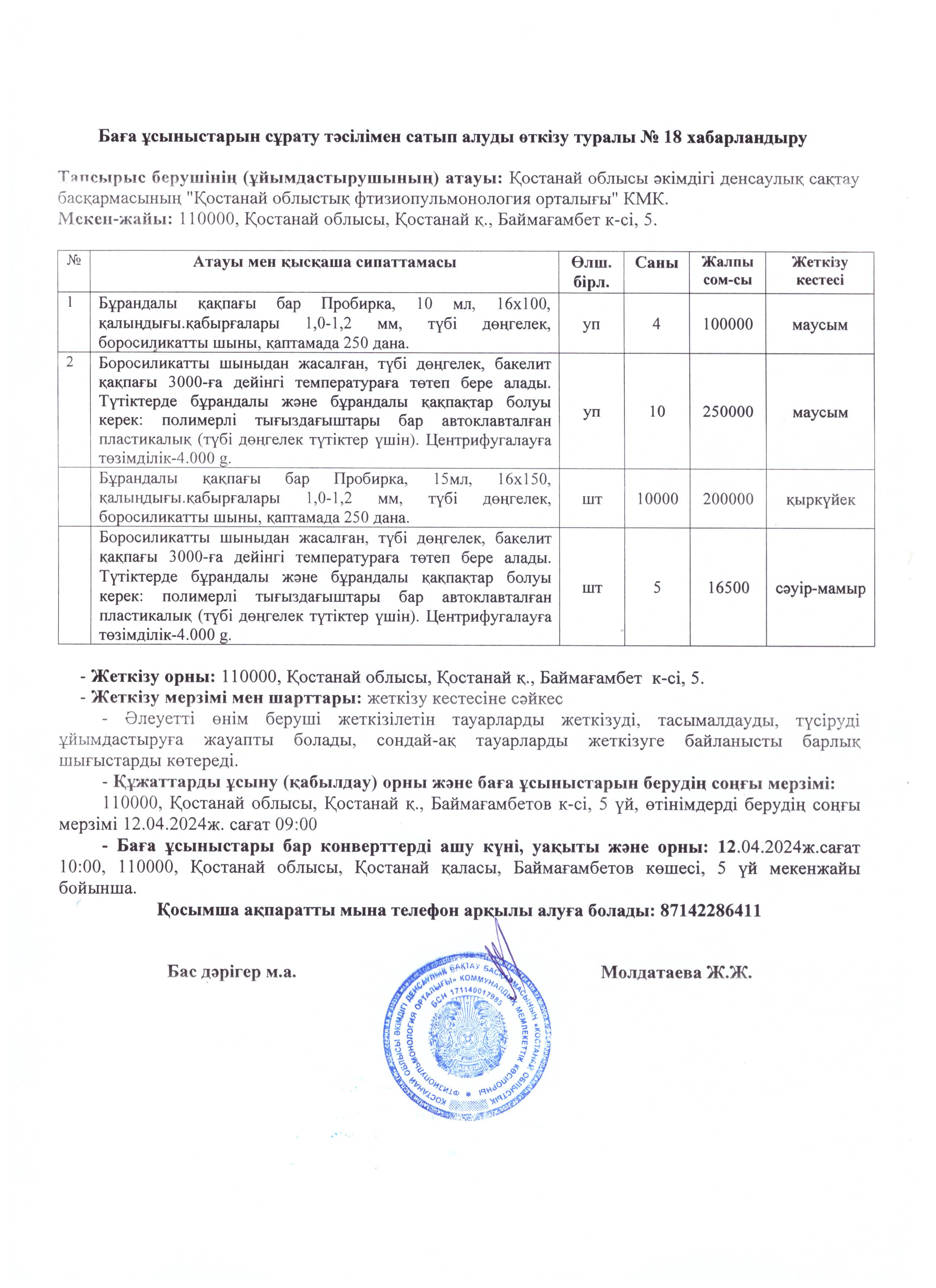 Баға ұсыныстарын сұрату тәсілімен сатып алуды өткізу туралы №18 Хабарландыру