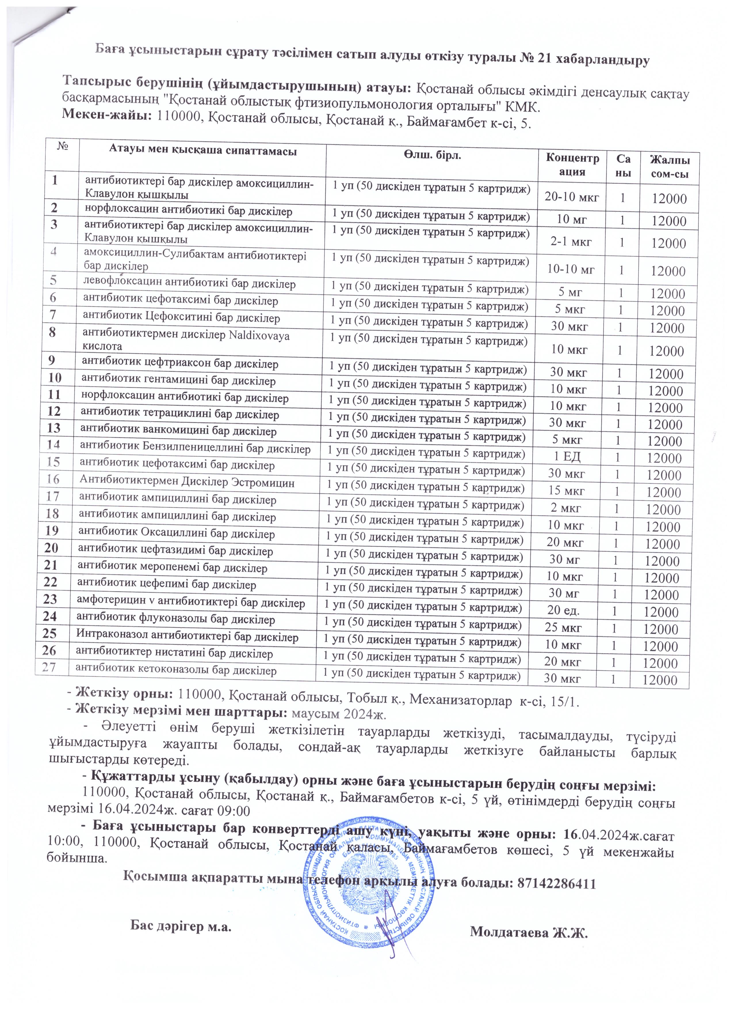 Баға ұсыныстарын сұрату тәсілімен сатып алуды өткізу туралы №21 Хабарландыру