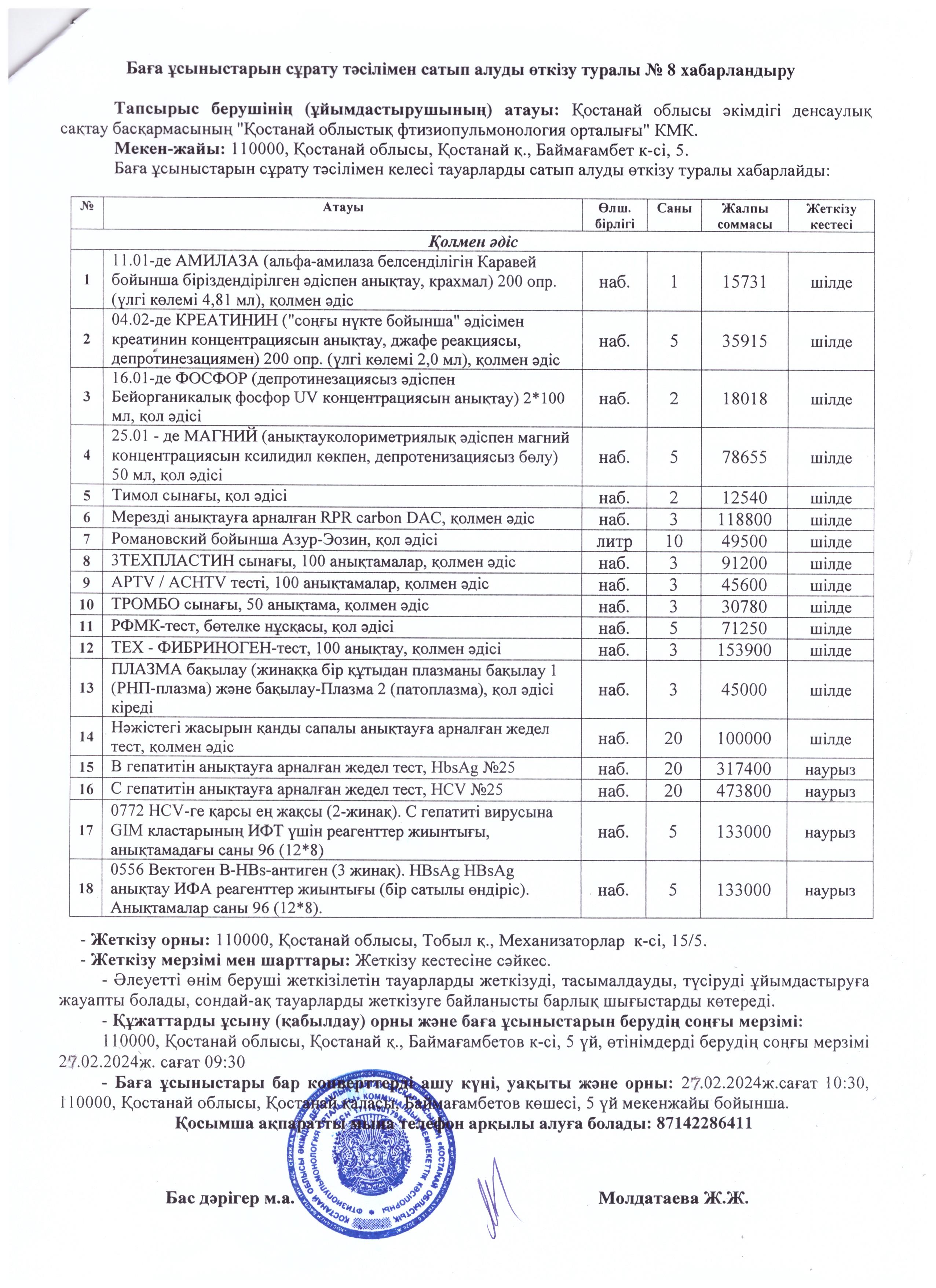 Баға ұсыныстарын сұрату тәсілімен сатып алуды өткізу туралы Хабарландыру №8