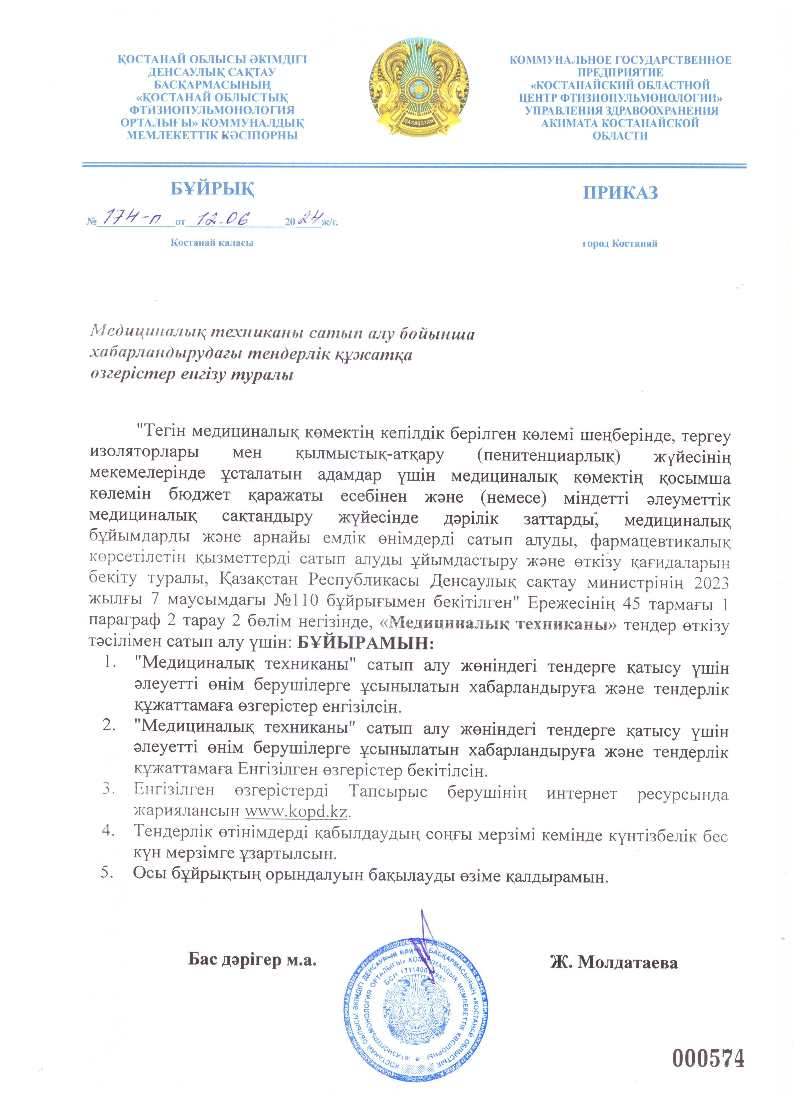 - Тендерлік өтінімдер салынған конверттерді ашу күні, уақыты және орны: 110000, Қостанай облысы, Қостанай қаласы, Баймағамбетов көшесі, 5 үй мекен-жайы бойынша 2024 жылғы "24" маусым сағат 11:00.