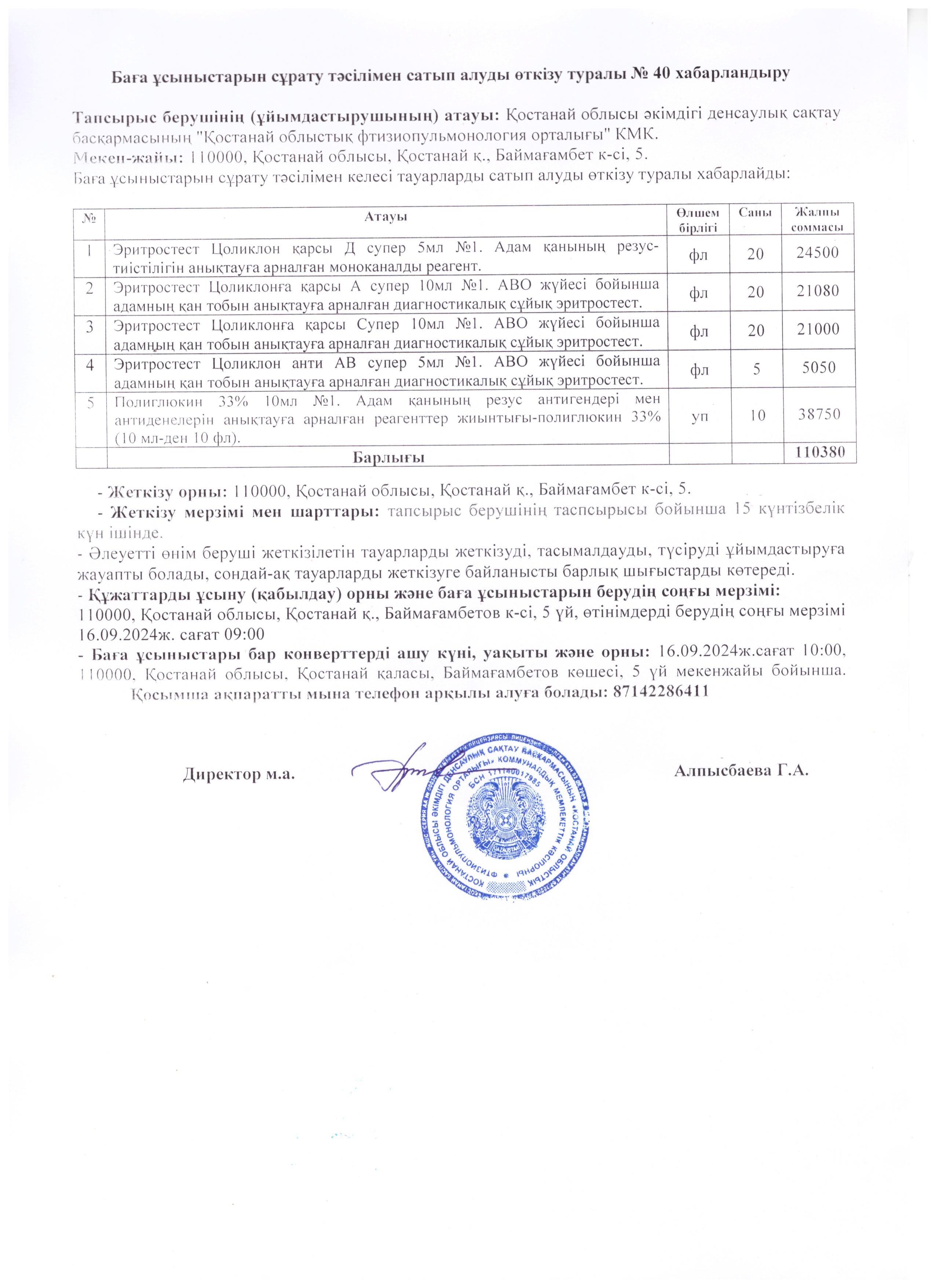 Баға ұсыныстарын сұрату тәсілімен сатып алуды өткізу туралы №40 хабарландыру