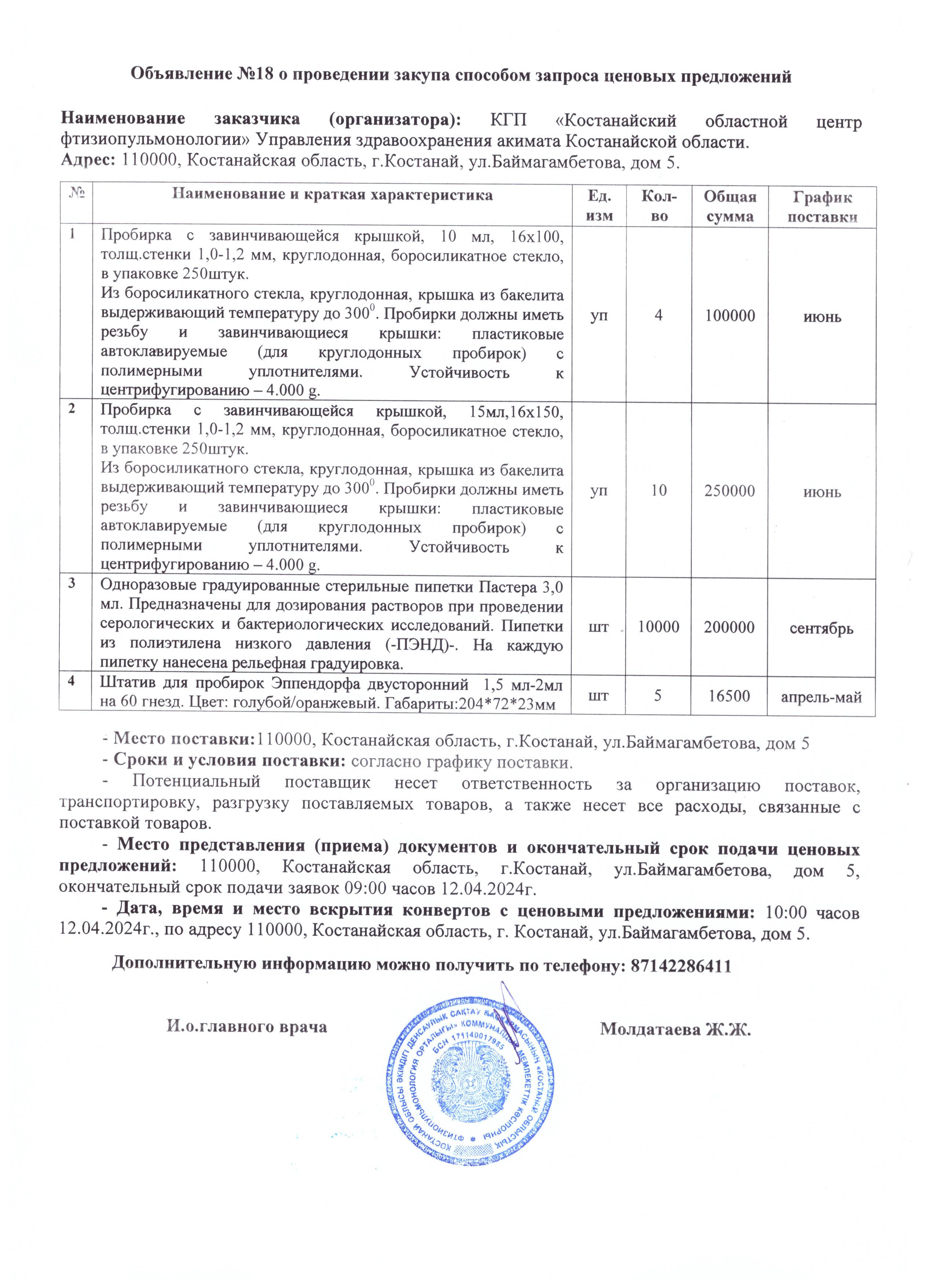 Объявление №18 о проведении закупа способом запроса ценовых предложений