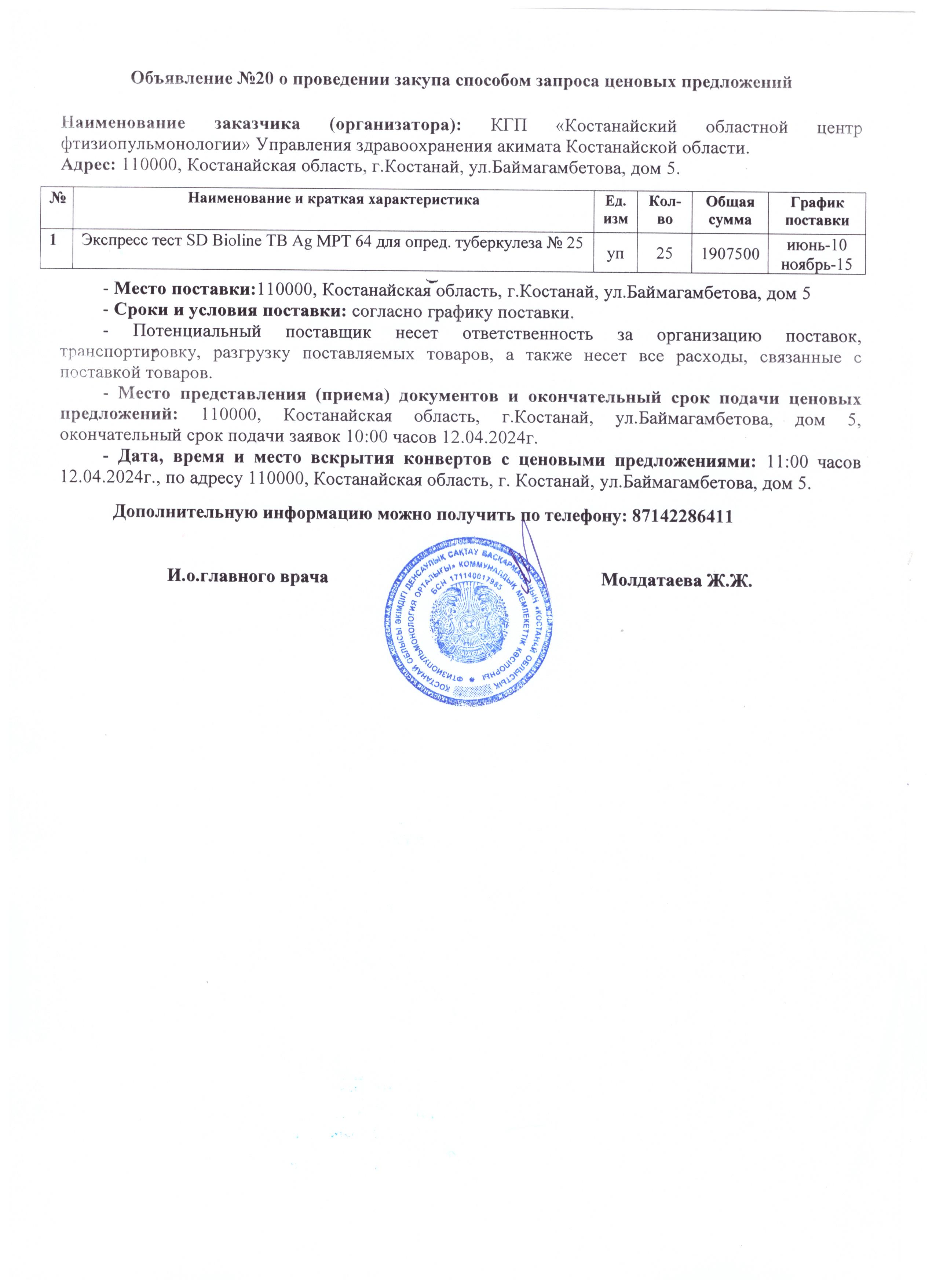 Объявление №20 о проведении закупа способом запроса ценовых предложений
