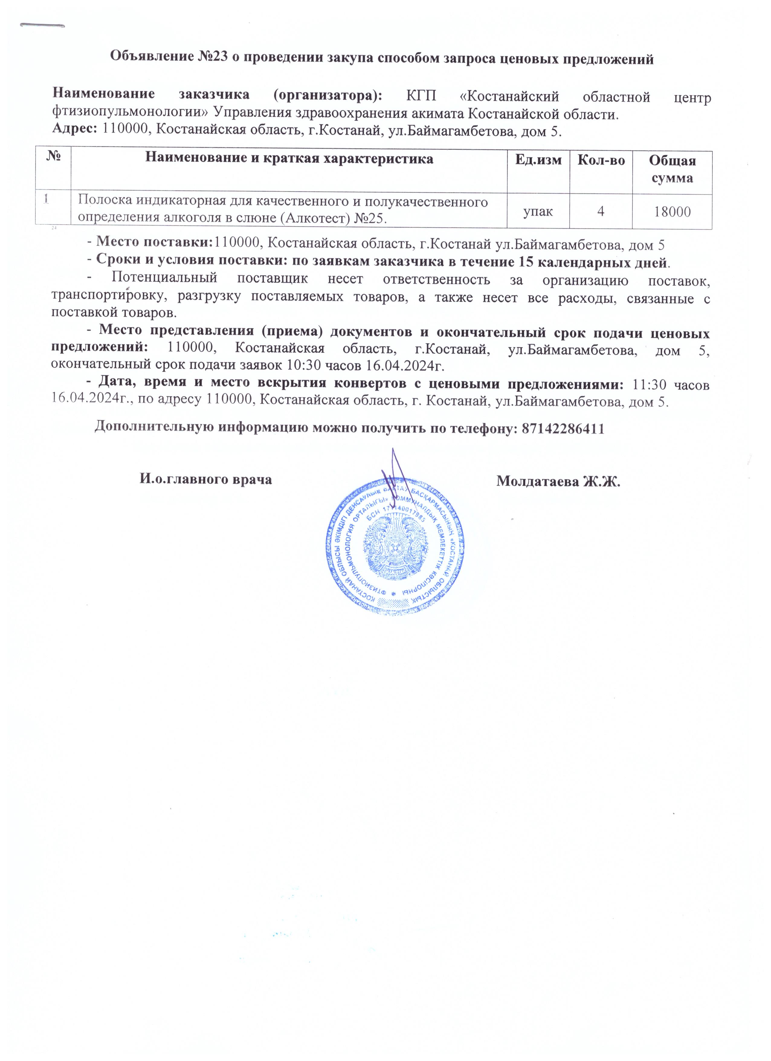 Объявление №23 о проведении закупа способом запроса ценовых предложений