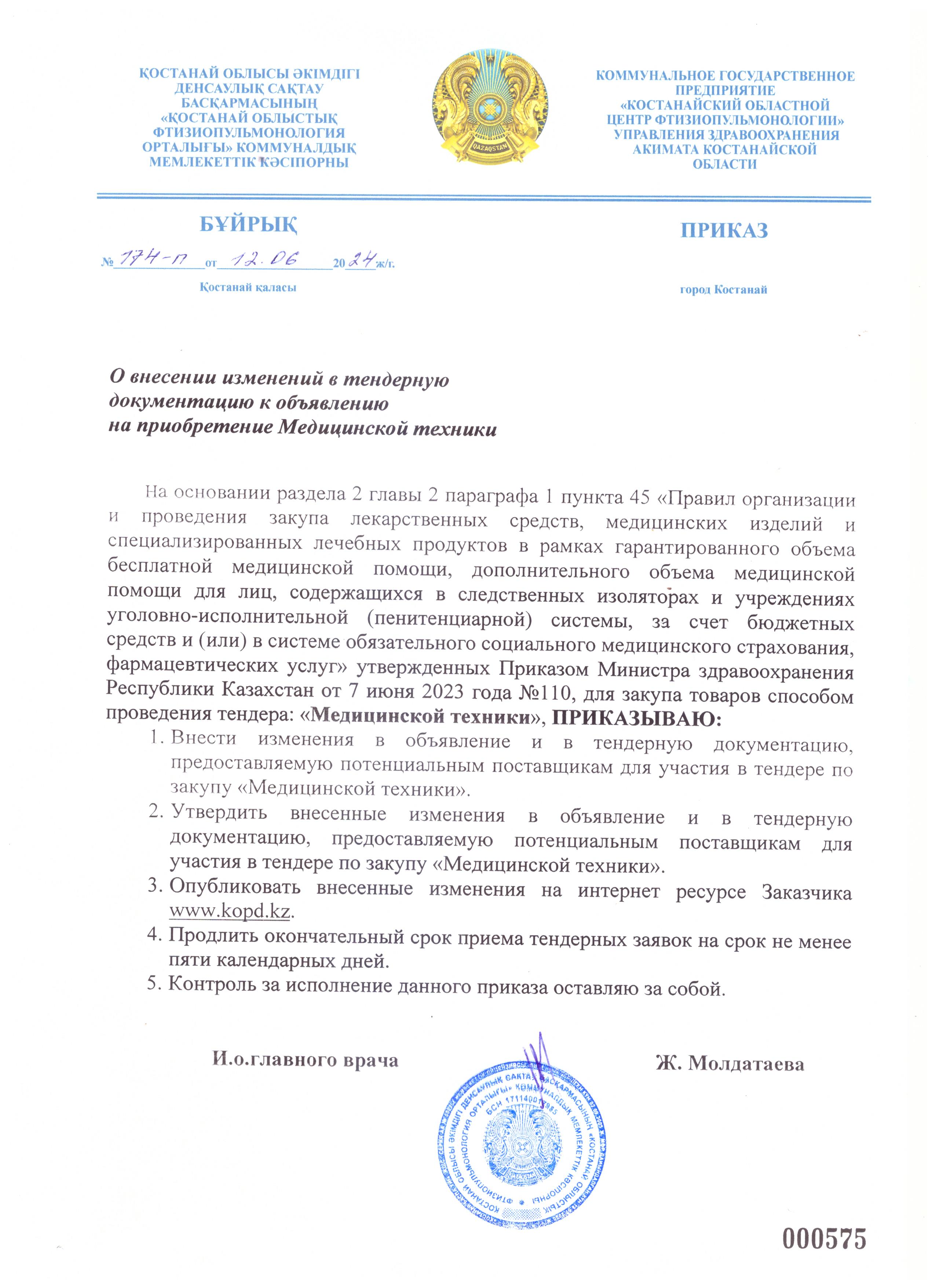 Место представления (приема) документов и окончательный срок подачи тендерных заявок: 110000, Костанайская область, г.Костанай, ул.Баймагамбетова, 5., окончательный срок подачи заявок 10:00 часов «24» июня 2024г.