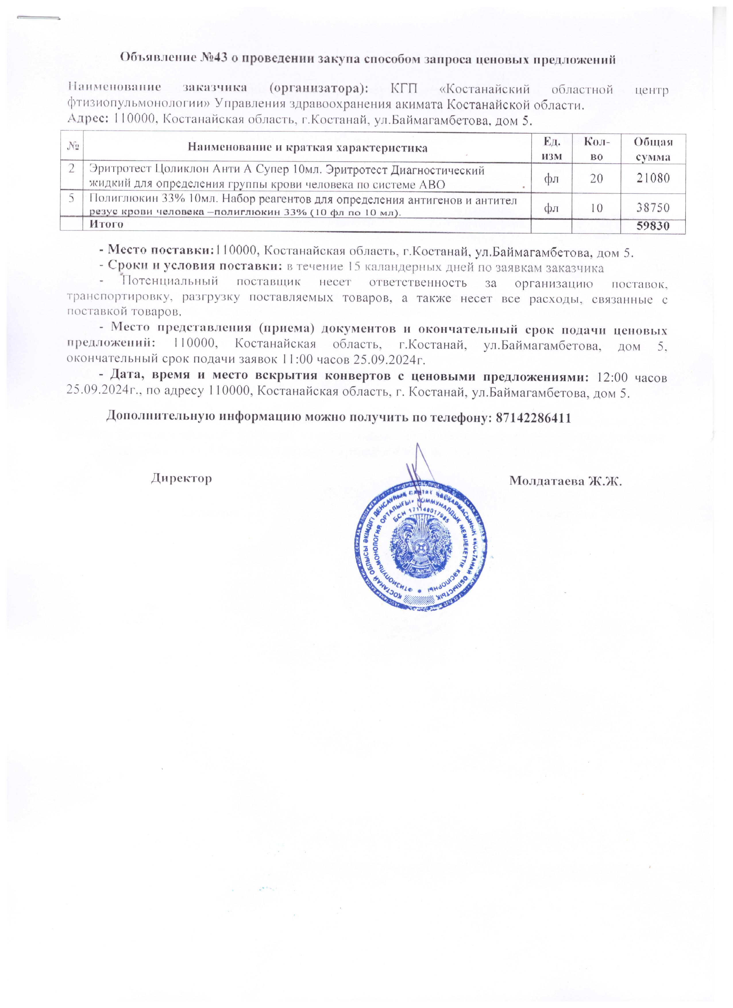 Объявление №43 о проведении закупа способом запроса ценовых предложений