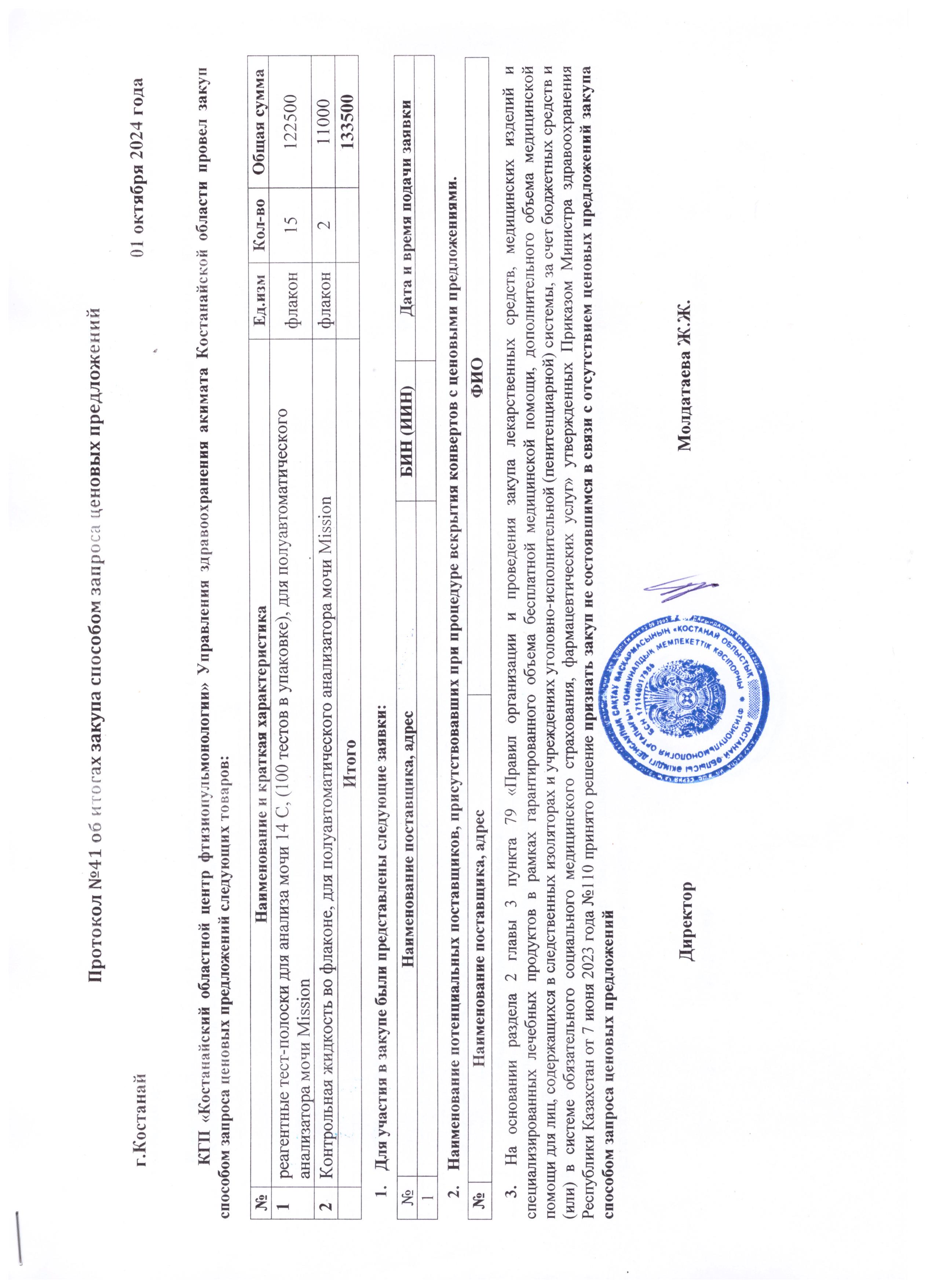 Протокол №41 об итогах закупа способом запроса ценовых предложений