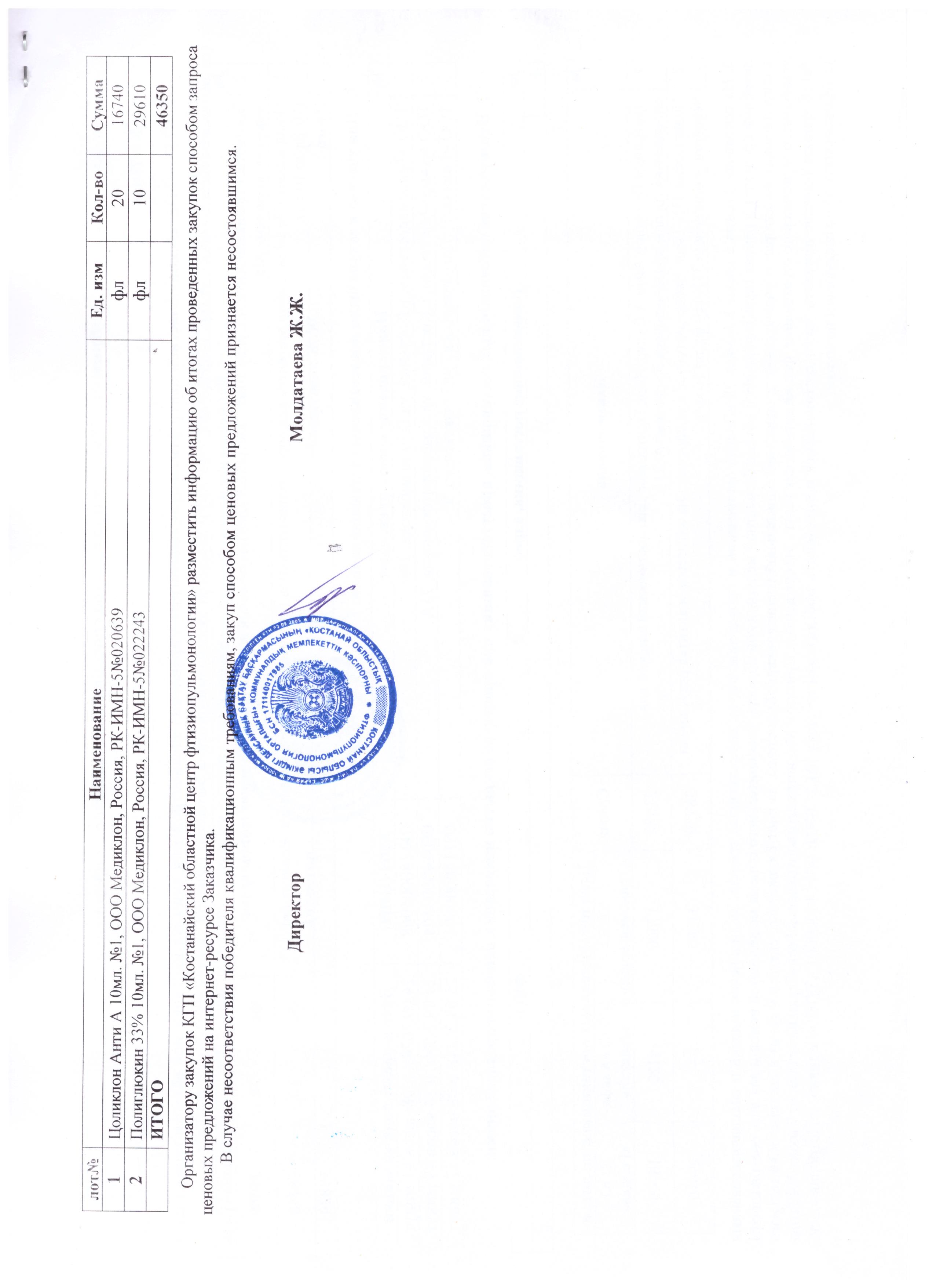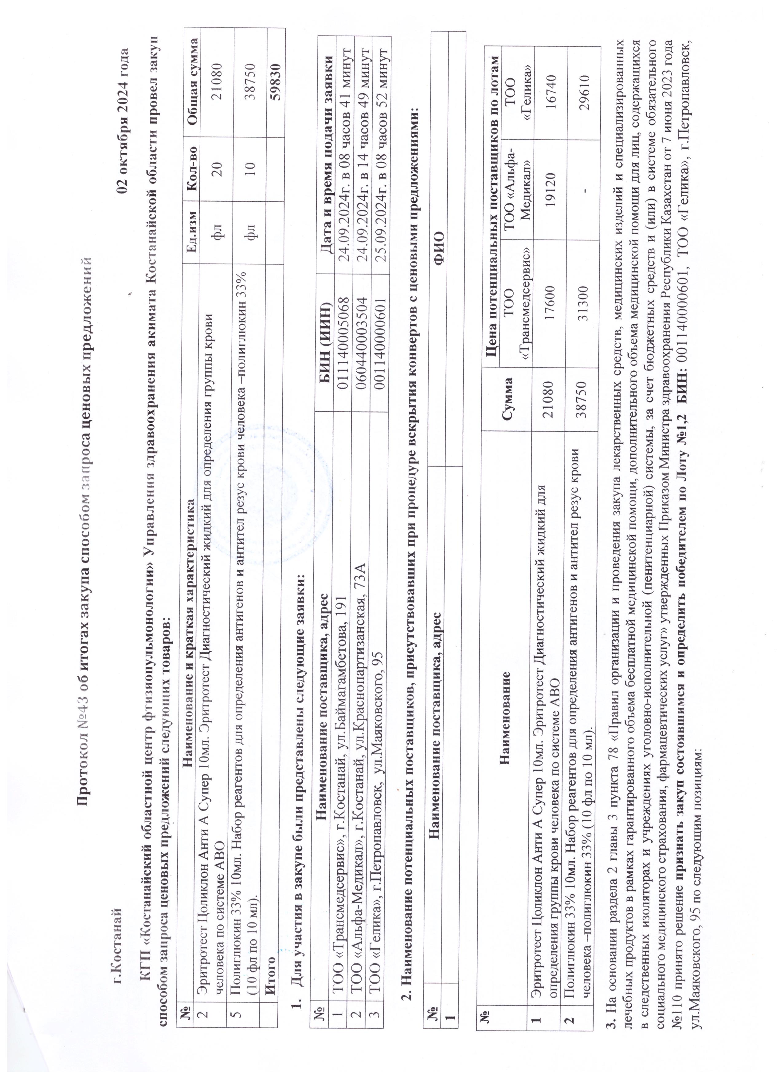 Протокол №43 об итогах закупа способом запроса ценовых предложений 1 лист