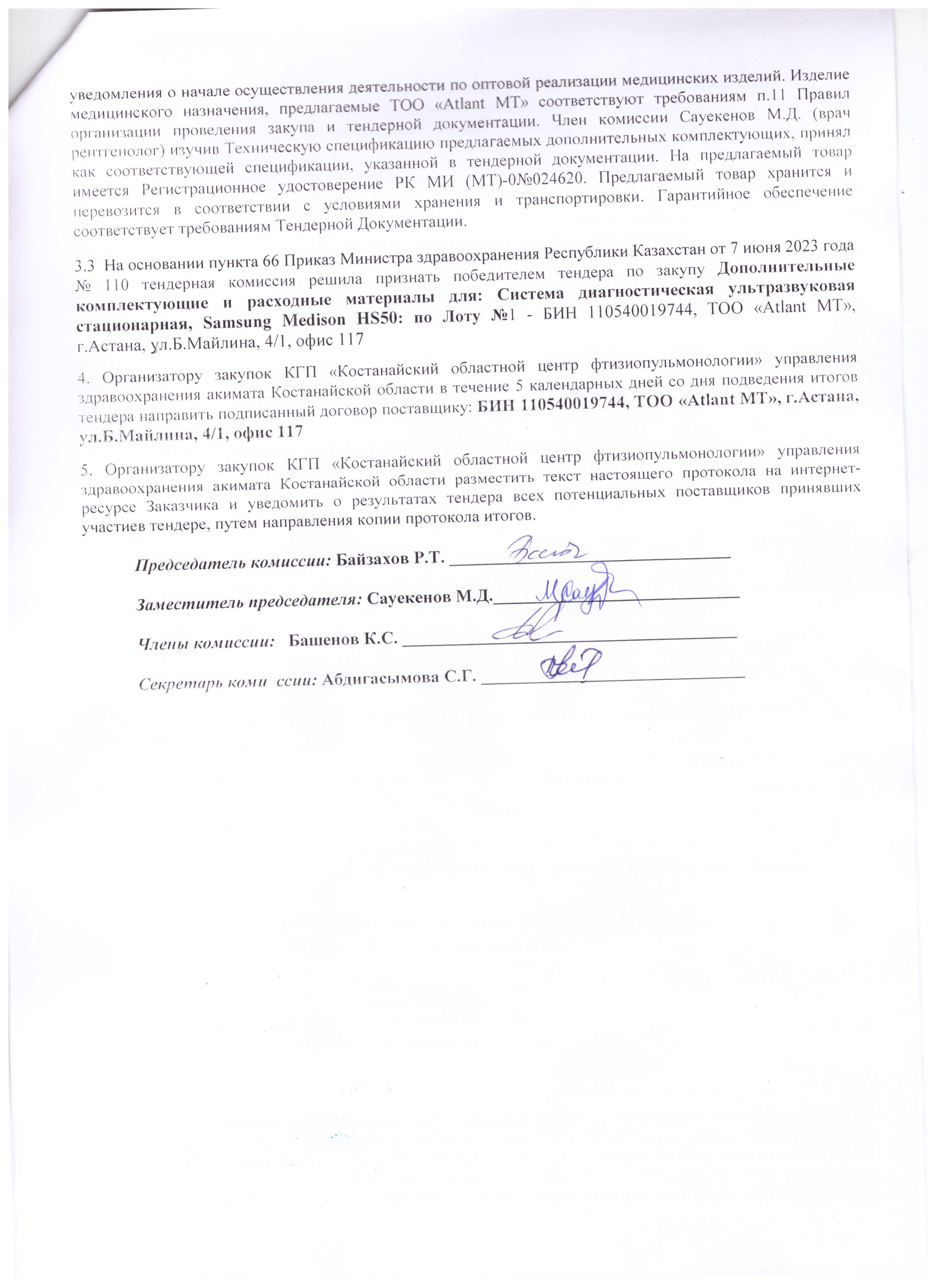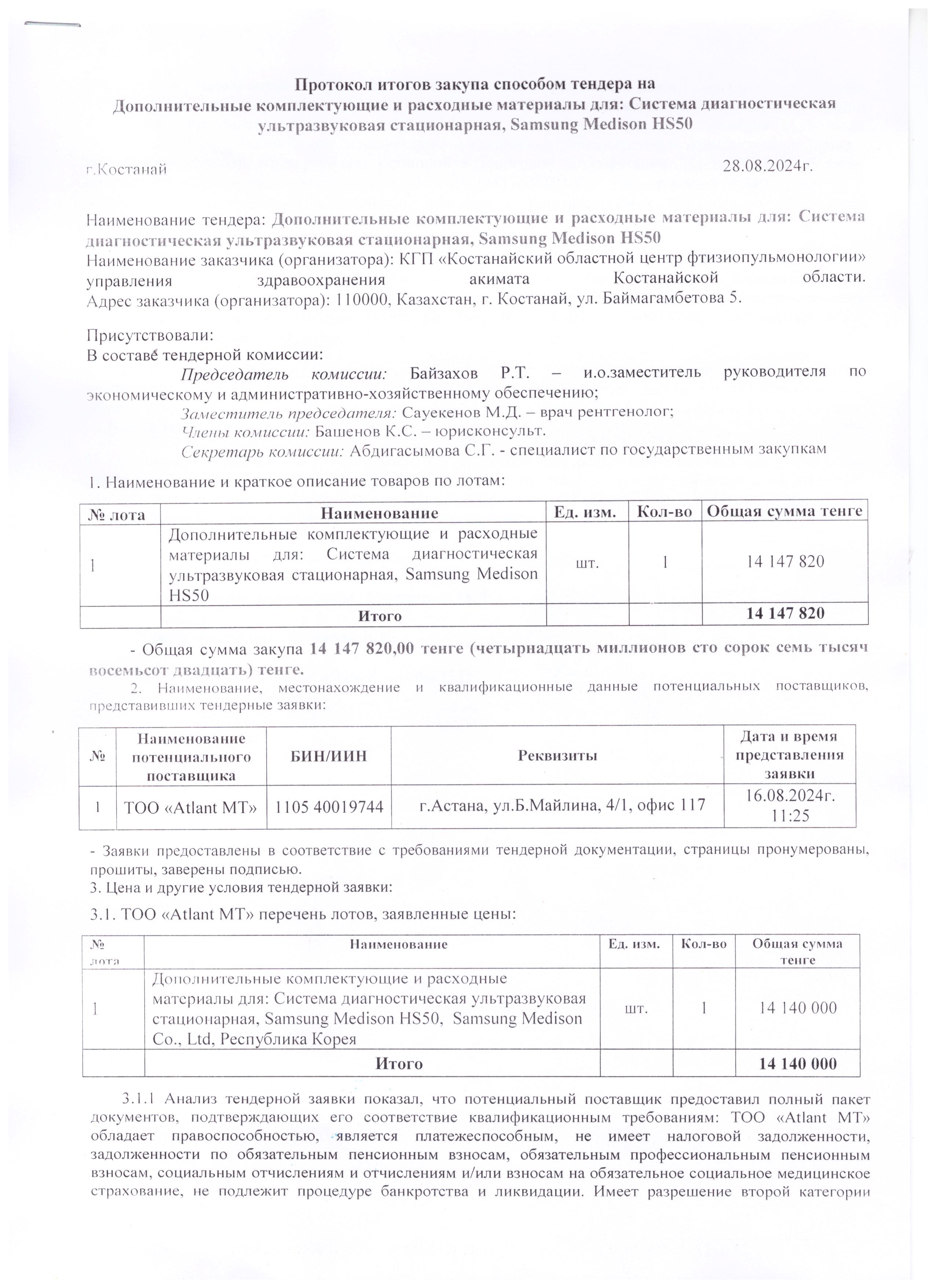 Протокол итогов закупа способом тендера на доп комплектующие и расходные материалы для УЗИ аппарата 1 лист